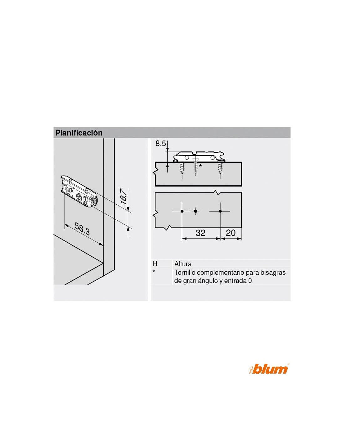 Esta base recta Blum destaca por su distancia de calce de 0 mm y una altura de 8,5 mm. El sistema de ajuste en altura mediante excéntrica de ±2 mm permite correcciones rápidas y sencillas, facilitando el alineamiento perfecto de puertas y frentes de muebles.