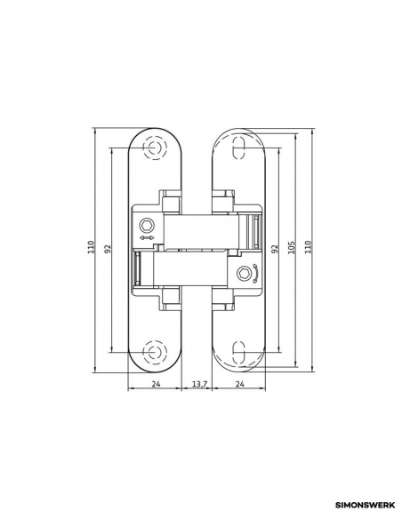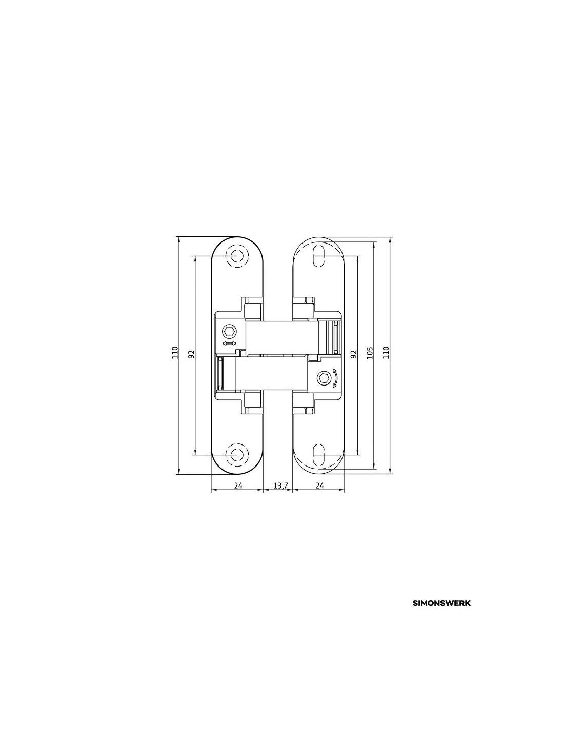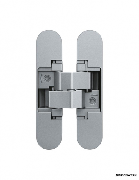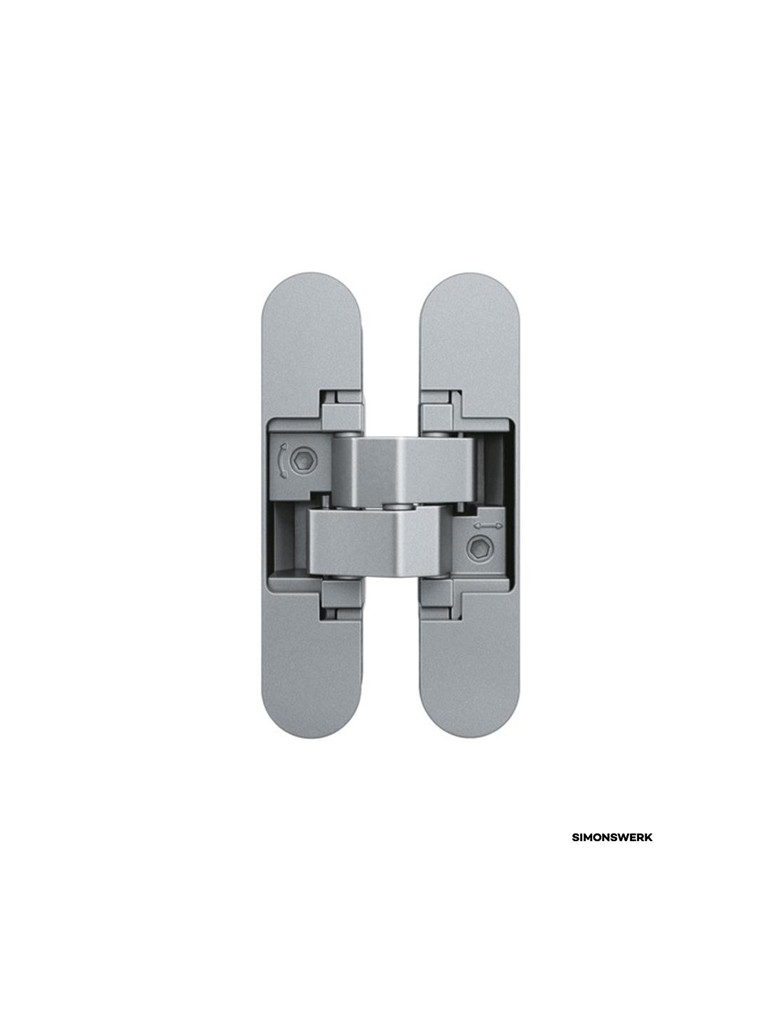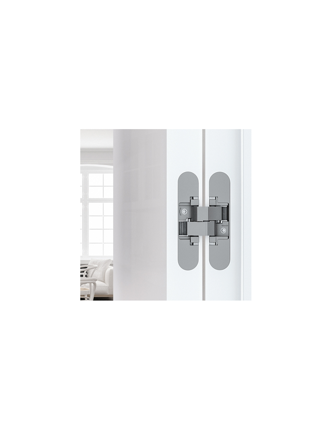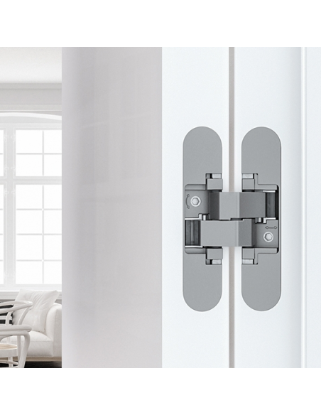 Bisagra invisible (oculta) AN 150 3D de Anselmi, perfecta para puertas de paso no solapadas (enrasadas) de hasta 40 kg. Su diseño minimalista la hace ideal para proyectos modernos que buscan la máxima discreción estética.
