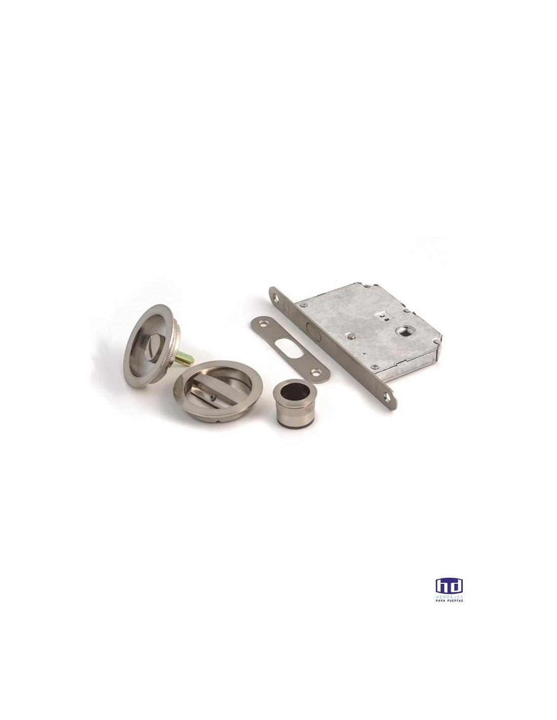 Cerradura de gancho (pico de loro) para puertas correderas de madera, la condena y el desbloqueo se embuten en la puerta, ocupando el mínimo espacio posible para que la puerta pueda deslizarse.