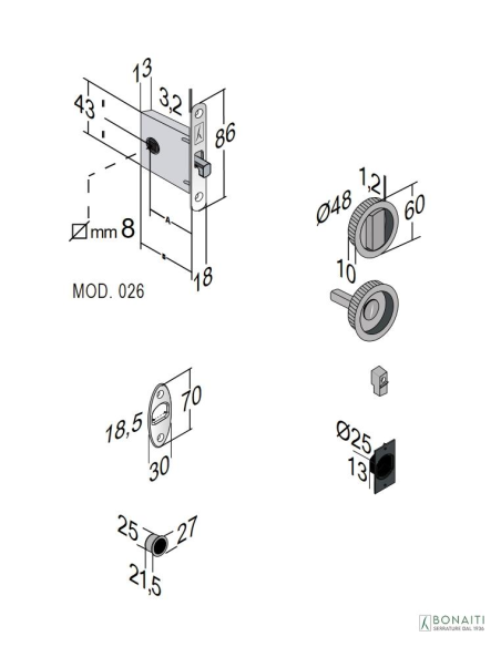 Optimiza la funcionalidad y el diseño de tus puertas correderas con el Kit Cerradura Corredera Bonaiti G500 mod. 026, una solución premium de la reconocida marca italiana Bonaiti que combina ingeniería de precisión, estética minimalista y máxima durabilidad.