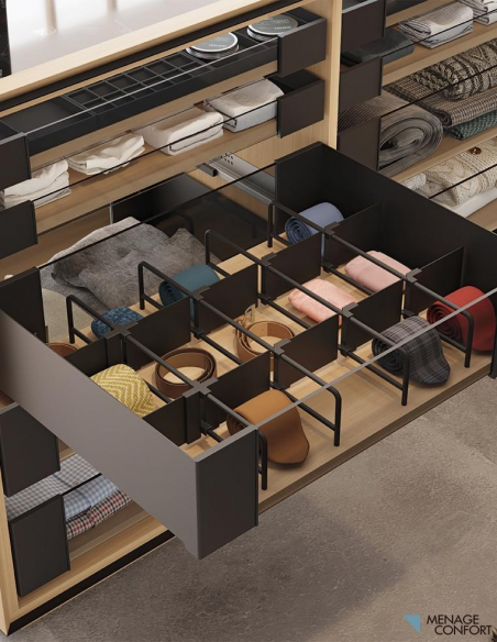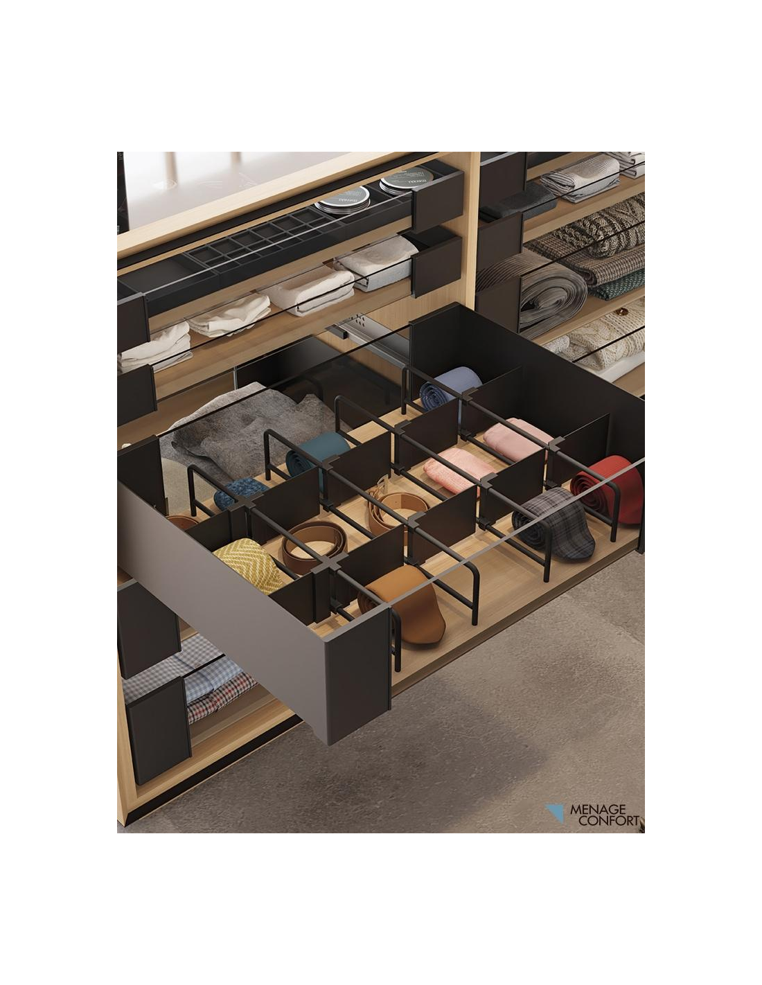 Optimiza tu cajón con el Divisor Chic de Menage Confort. Fabricado en acero antracita, es ideal para organizar tu bandeja extraíble Chic. ¡Orden y estilo para tus cajones!