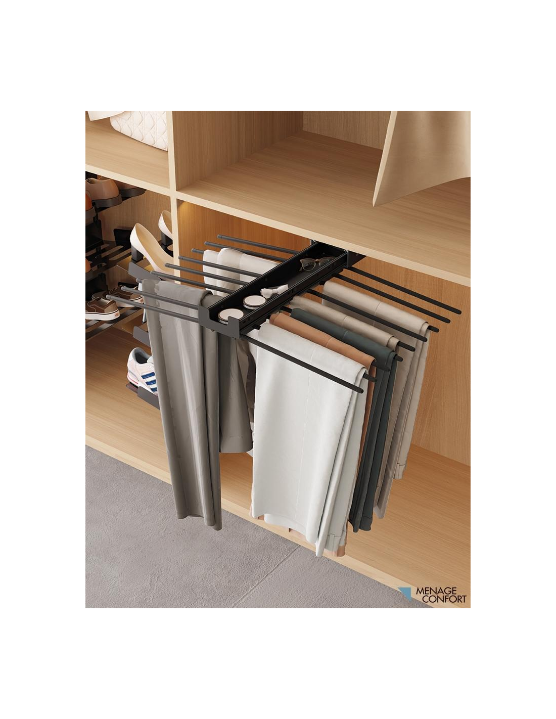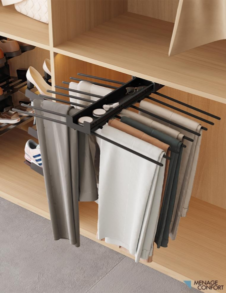 Transforma tu armario en un espacio más funcional y estético con el pantalonero extraíble Menage Confort Chic, la solución definitiva para el orden de tus pantalones.